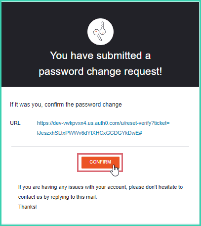 Click the Confirm button in the email. The Postsale Change Your Password page will open in a new browser tab.