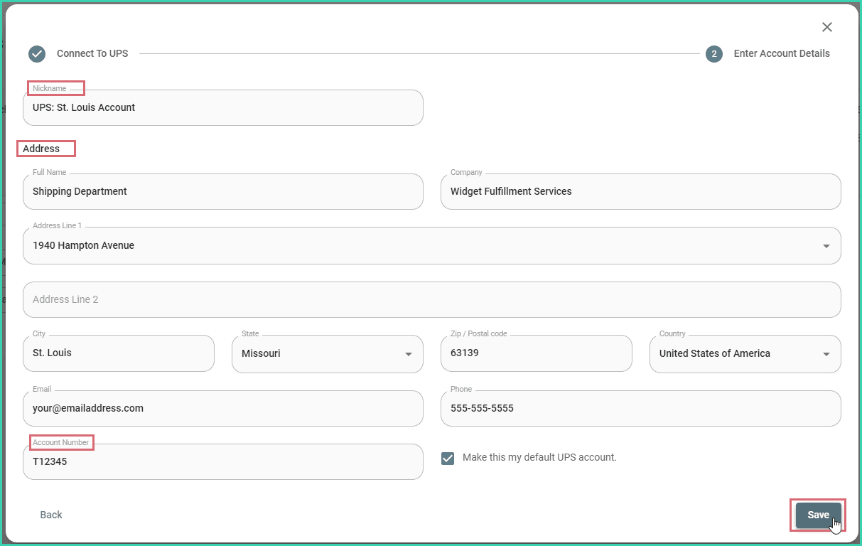 When more than one UPS account is added to Postsale, use the Make this my default UPS account checkbox to indicate that this account should be used to calculate and display rates in Postsale and to create UPS shipping labels.