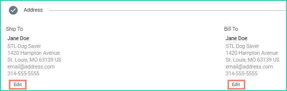 Verify that the Ship To and Bill To addresses are correct. Click the Edit link for either address to update it.