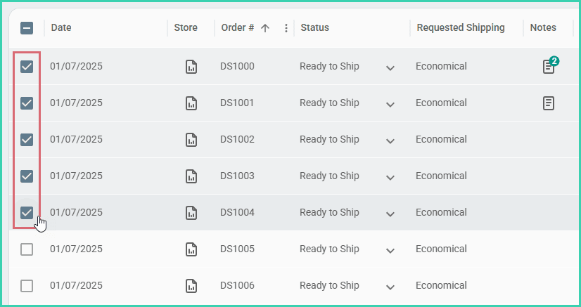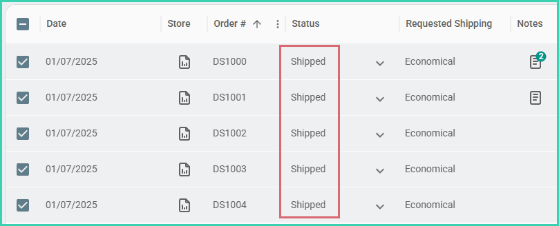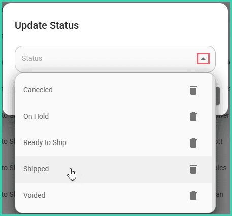 - Keep in mind that updating order statuses may change the filters in which the orders appear. For example, when changing an order's status from Ready to Ship to Shipped the order will no longer appear in the Ready to Ship filter and will appear in the Shipped filter.