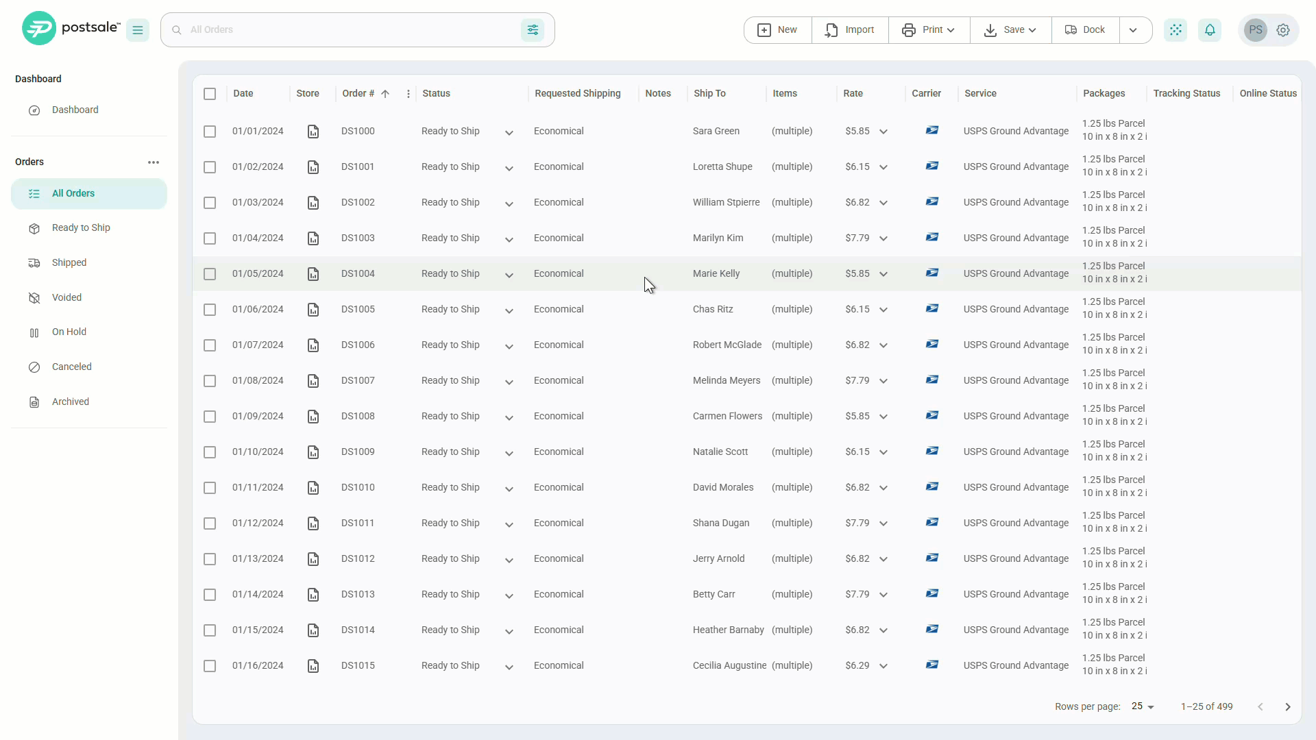 Assign order statuses to your orders (Ready to Ship, Shipped, Voided, etc.) to keep track of where your orders are in your Postsale workflow. Order statuses can also be used to trigger automated tasks like sending shipment notifications to your customers.