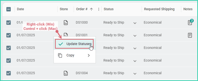 Right-click (Windows) or Control + click (Mac) on any selected order. Then, choose Update Statuses from the Shortcut Menu.