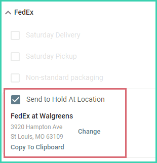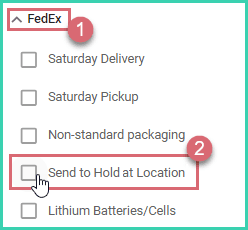 Expand the FedEx section of the Dock. Then, check the Send to Hold at Location option.