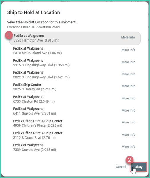 Select the Hold at Location from the list of available options. Then, click the Okay button. Click the More Info link to view additional details about a location.