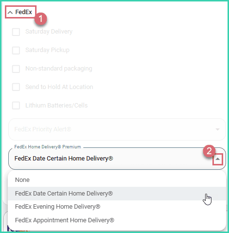 Expand the FedEx section of the Dock. Then, select the correct option from the FedEx Home Delivery® Premium drop-down menu.