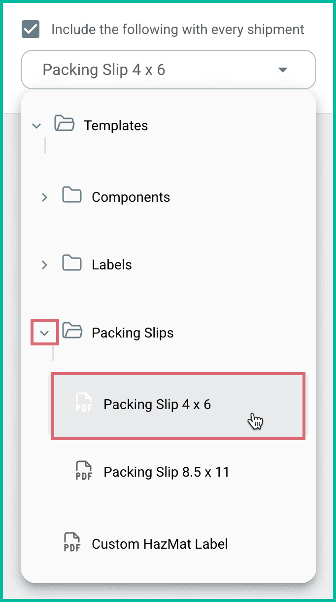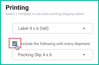 Optionally, you can specify that you wish for an additional template, such as a packing slip, to be printed at the same time as the shipping label and select the correct packing slip template for the size you wish to print.