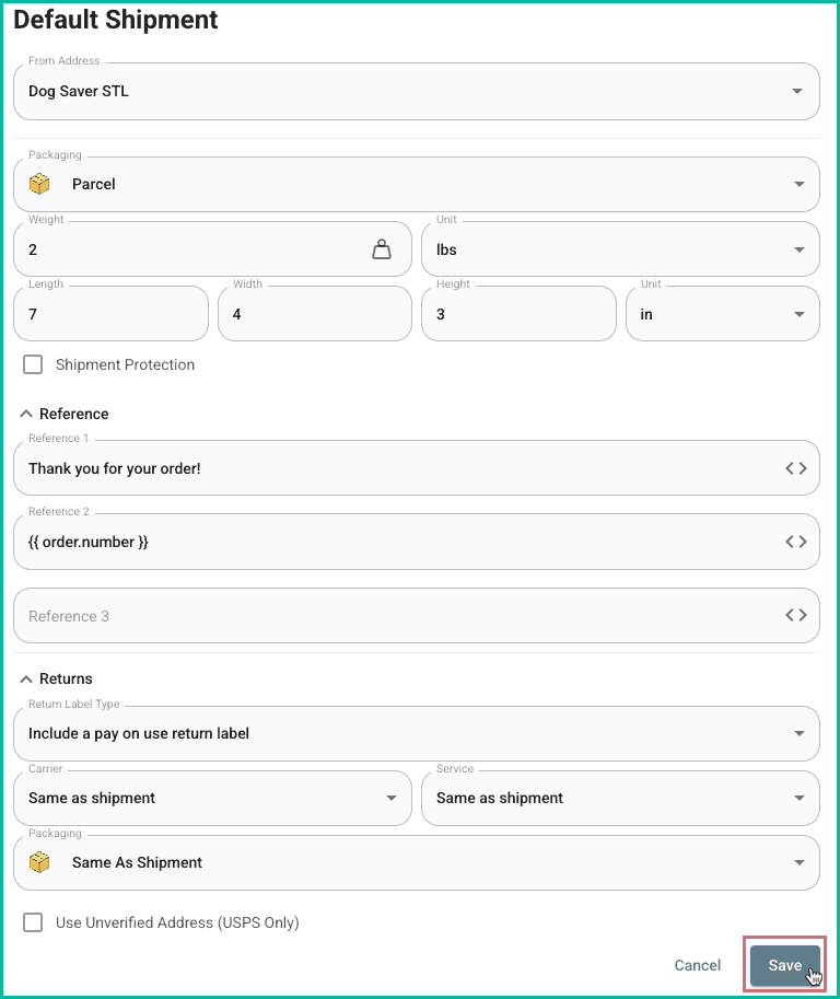 - The default packaging, weight, and dimensions will be used to automatically apply the most economical shipping carrier and service to new shipments.