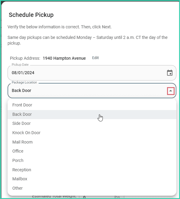 Select the Pickup Date from the calendar pop-up. Same day pickups can be scheduled Monday – Saturday until 2 a.m. CT the day of the pickup.