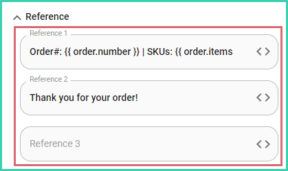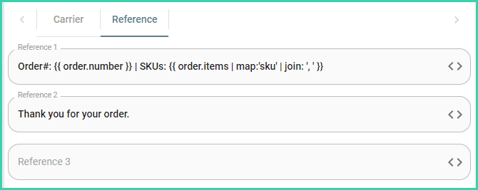 Order#: {{ order.number }} | SKUs: {{ order.items | map:'sku' | join: ', ' }}If the carrier supports multiple references, you could also include a personal message in another reference field.