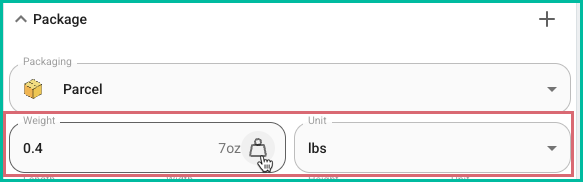 Place the package on the scale. The weight the scale is reading is displayed next to the scale icon in the Weight field. The displayed weight updates in real time as the weight on the scale changes.