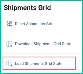 Click Download Shipments Grid State in the Shipments Grid section. A file containing your current grid settings and layout is automatically downloaded to your computer. The default file name is Shipment_Grid.json and is typically downloaded to the Downloads folder for your web browser.