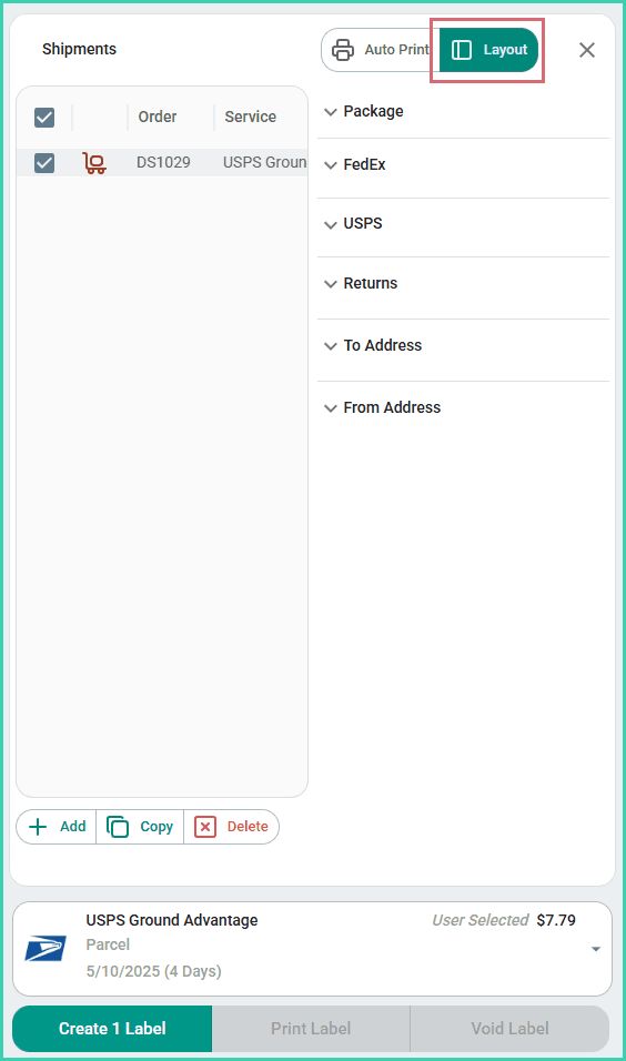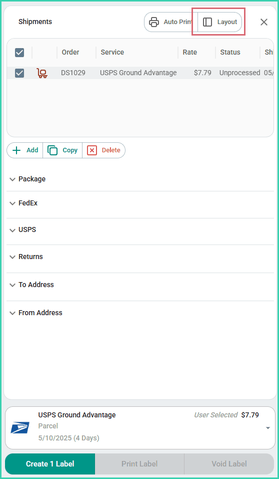 Postsale’s Dock is your main work area when shipping your orders. The Dock gives you the ability to view and edit shipment details and to create, print, and void shipping labels.