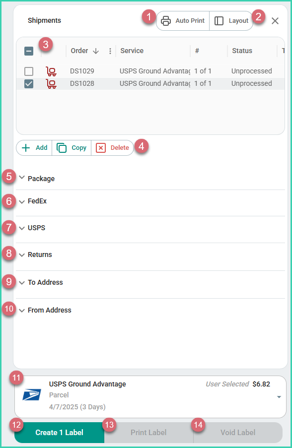 11 - Rate Selector: Displays the rate for the selected shipment. Click the selector to choose a different, available carrier and service.