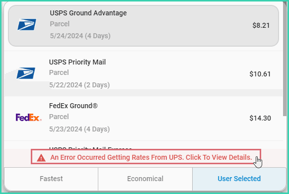 The rate selector displays rates and available services based on an order's shipment details. If shipment details are incorrect or missing, an error will notify you that rates could not be displayed for one or more carriers. Click the error to view more details.
