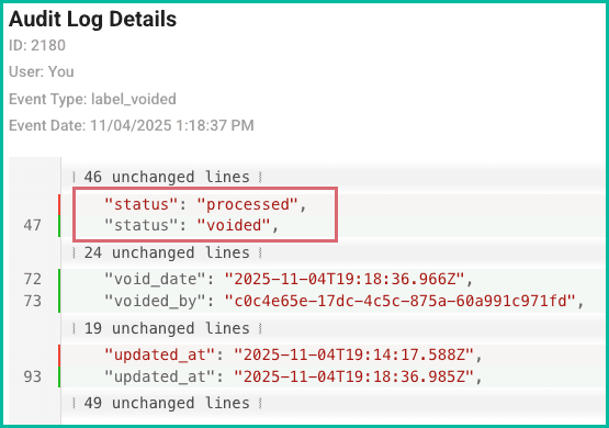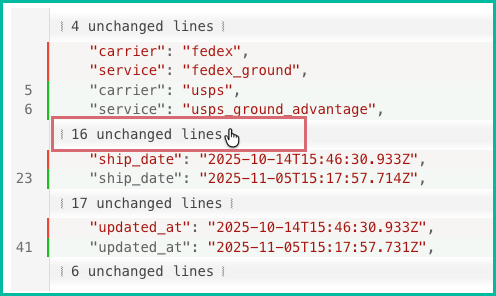 Take a look at the image below. In addition to the timestamps indicating when the changes occurred, we can easily see that the carrier and service (in red) were changed from fedex and fedex_ground to carrier and service (in green) usps and usps_ground_advantage.