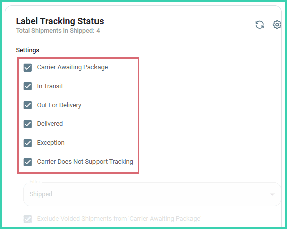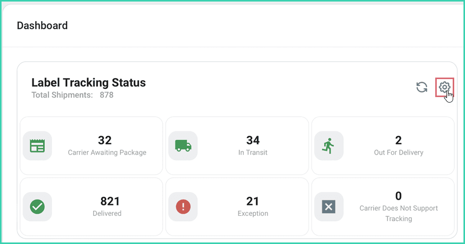 The Label Tracking Status widget on the Dashboard allows you to quickly view how many orders are in any given tracking status. You can then drill down further to view orders in a particular status.