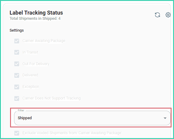 - Select a Filter from your list of filters in the Orders Menu. Only the orders that meet the conditions of the selected filter will be used to calculate the results of the Label Tracking Status widget.