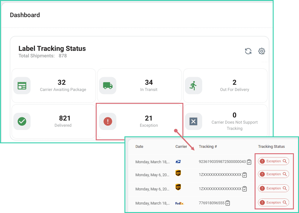 For example: Clicking the Exception status would open the Orders Grid and display 21 orders with shipments in the Exception status. You could then view the tracking history for more information on the shipment exception of each shipment.
