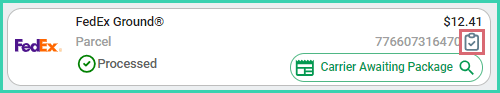 Copy a tracking number from the Tracking # column on the Orders Grid or from the Rate Selector in the Dock by clicking on the Clipboard icon next to the tracking number. This is useful when you need to paste the tracking number into another field or application, such as when tracking a package directly on the carrier website.