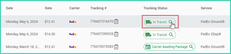 Tracking numbers and current tracking statuses can be viewed in the Orders Grid and in the Dock, allowing you to view the tracking status history or copy the tracking number for any shipment. Learn how to add columns to the Orders Grid or Shipments Grid in the Dock.