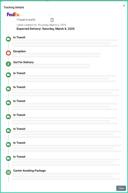 - Tracking events provided to Postsale from the shipping carrier with the most recent event at the top of the list